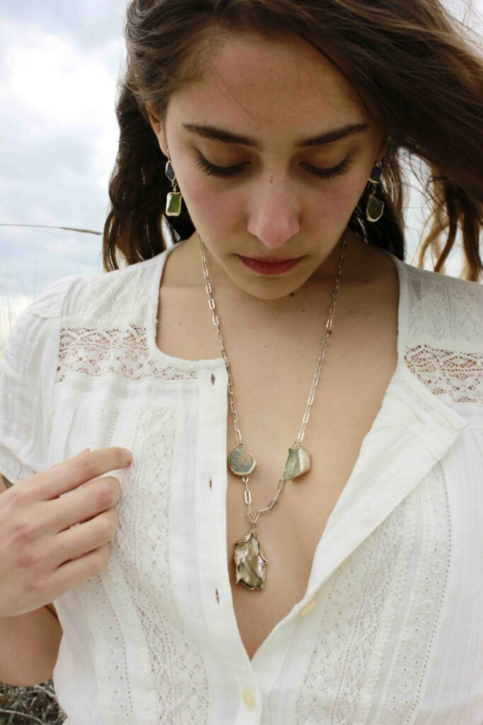 This long necklace features an abalone, an ammonite and a white amethyst. A bold statement necklace perfect for your summer outfits. The necklace…