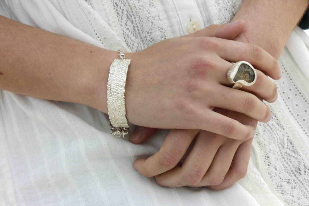 £295.00An old ammonite stone set in sterling silver. The ring is part of the Tethys collection. Each piece is one of a kind,…